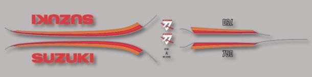 This 13 piece complete decal set includes gas tank, fairing, side panel & choke switch decals for the 1983 GS750 Katana Silver model with orange/red stripes.